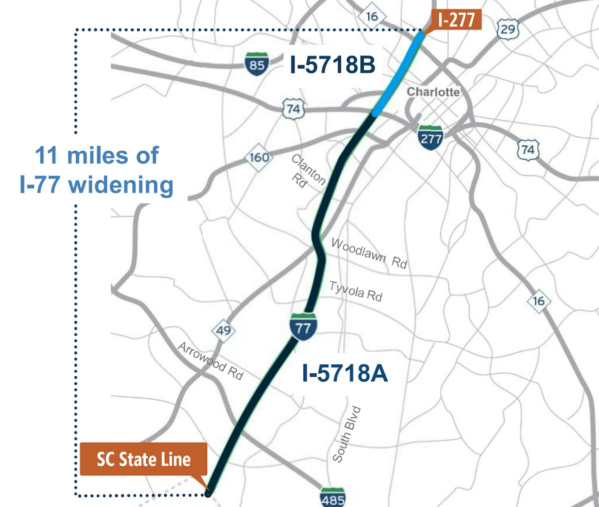 The proposed project, estimated to cost $3.7 billion, would widen about 11 miles of I-77 to 10 lanes by adding two express lanes in each direction from I-277/N.C. 16 (Brookshire Freeway) in Charlotte to the South Carolina state line. The project was originally identified in 2007.